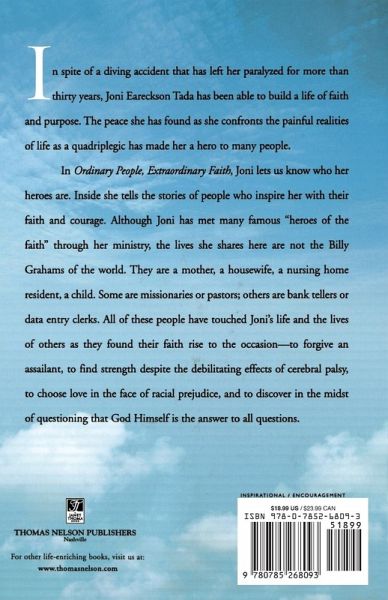 In spite of a diving accident that has left her paralyzed for more than thirty years, Joni Eareckson Tada has been able to build a life of faith and purpose. The peace she has found as she confronts the painful realities of life as a quadriplegic has made her a hero to many people. In Ordinary People, Extraordinary Faith, Joni lets us know who her heroes are. Inside she tells the stories of people who inspire her with their faith and courage. Although Joni has met many famous "heroes of the faith" through her ministry, the lives she shares here are not the Billy Grahams of the world. They are a mother, a housewife, a nursing home resident, a child. Some are missionaries or pastors; others are bank tellers or data entry clerks. All of these people have touched Joni's life and the lives of others as they found their faith rise to the occasion - to forgive an assailant, to find strength despite the debilitating effects of cerebral palsy, to choose love in the face of racial prejudice, and to discover in the midst of questioning that God Himself is the answer to all questions.