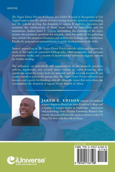 The Organ Donor Process: A Diverse and Global Reward in Recognition of Life Support approaches the cluster of issues arising from the practices surrounding and the policies guiding the donation of organs. It explores, discusses, and examines the ramifications of those issues both for individuals and for institutions. Author Jared E. Edison summarizes the contours of the topic, reviews the pertinent questions for research, states his methods for gathering data, reviews the pertinent literature, and outlines his findings and conclusions. Finally, he proposes recommendations to guide developments in the field. Several appendices in The Organ Donor Process provide additional support for study of the topic: an annotated bibliography offers summaries and critiques of pertinent works, and a section of recommended resources suggests options for further reading. The influences on individuals and organizations of the research, practices, policies, regulations, and societal norms related to organ donations raise significant issues for many, both for personal and for societal reasons. If you count yourself as part of this group, then The Organ Donor Process will serve as a resource and a guide for thinking critically about the issues that arise when one contemplates the donation of organs for the benefit of others.