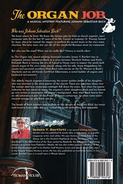 Award-winning historical novelist James Y. Bartlett has reimagined the great German composer and keyboard virtuoso Johann Sebastian Bach as a cross between Sherlock Holmes and Keith Richards in this imaginative new historical mystery. During a visit to the German city of Kassel to inspect the church's newly constructed pipe organ, (based on an actual event in his life) Bach, his wife Anna Magdalena and his cousin and personal secretary Elias Bach (who serves as Dr. Watson to Bach's Sherlock) discover that the pastor of the church may have murdered his young wife. And while they investigate that, Bach learns an old adversary from his past is a guest of the Prince of Hesse, and he plots some musical revenge. While the heads of Bach scholars may explode, Bartlett has created a delightful contrapuntal mystery set in the heart of 18th century Germany that music and mystery lovers are sure to enjoy.