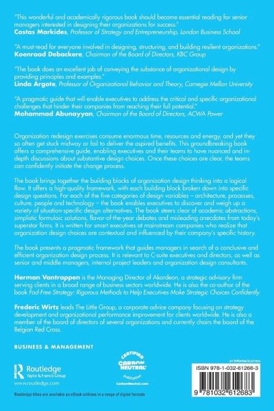 "The Organization Design Guide is a must-read for managers and consultants interested in how to design organizations to improve their performance. Vantrappen and Wirtz are comprehensive in their treatment of dimensions of organizational design, including (de)centralization, lateral coordination, the corporate parent and technology. The authors convincingly argue that although the process of changing an organization's design (aka change management) is useful, the substance of the change is paramount. The book does an excellent job of conveying the substance of organizational design by providing principles and examples from their experience."