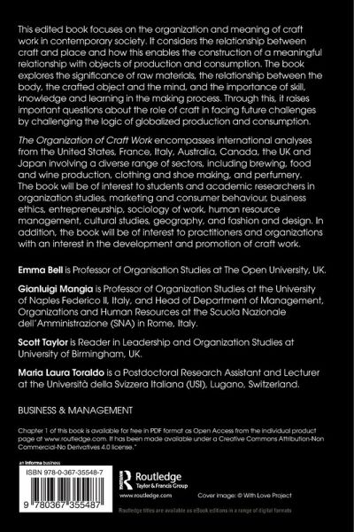 The Organization of Craft Work encompasses international analyses from the United States, France, Italy, Australia, Canada, the UK and Japan involving a diverse range of sectors, including brewing, food and wine production, clothing and shoe making, and perfumery. The book will be of interest to students and academic researchers in organization studies, marketing and consumer behaviour, business ethics, entrepreneurship, sociology of work, human resource management, cultural studies, geography, and fashion and design. In addition, the book will be of interest to practitioners and organizations with an interest in the development and promotion of craft work.