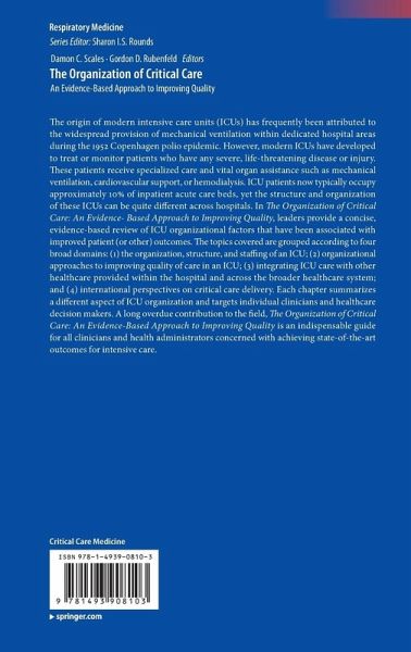 The origin of modern intensive care units (ICUs) has frequently been attributed to the widespread provision of mechanical ventilation within dedicated hospital areas during the 1952 Copenhagen polio epidemic. However, modern ICUs have developed to treat or monitor patients who have any severe, life-threatening disease or injury. These patients receive specialized care and vital organ assistance such as mechanical ventilation, cardiovascular support, or hemodialysis. ICU patients now typically occupy approximately 10% of inpatient acute care beds, yet the structure and organization of these ICUs can be quite different across hospitals. In The Organization of Critical Care: An Evidence-Based Approach to Improving Quality, leaders provide a concise, evidence-based review of ICU organizational factors that have been associated with improved patient (or other) outcomes. The topics covered are grouped according to four broad domains: (1) the organization, structure, and staffing of an ICU; (2) organizational approaches to improving quality of care in an ICU; (3) integrating ICU care with other healthcare provided within the hospital and across the broader healthcare system; and (4) international perspectives on critical care delivery. Each chapter summarizes a different aspect of ICU organization and targets individual clinicians and healthcare decision makers. A long overdue contribution to the field, The Organization of Critical Care: An Evidence-Based Approach to Improving Quality is an indispensable guide for all clinicians and health administrators concerned with achieving state-of-the-art outcomes for intensive care.