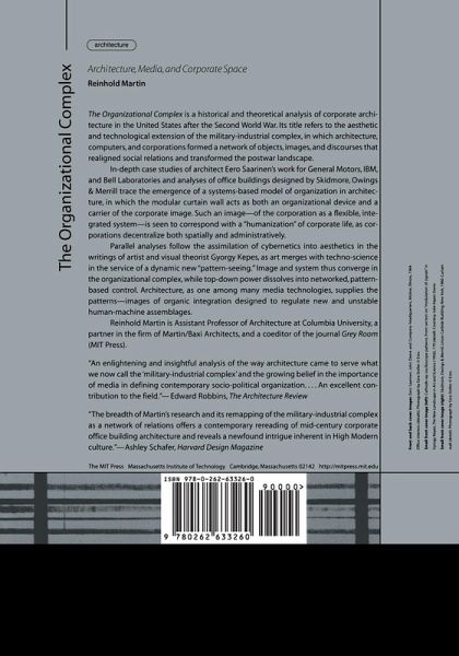 A historical and theoretical analysis of corporate architecture in the United States after the Second World War. The Organizational Complex is a historical and theoretical analysis of corporate architecture in the United States after the Second World War. Its title refers to the aesthetic and technological extension of the military-industrial complex, in which architecture, computers, and corporations formed a network of objects, images, and discourses that realigned social relations and transformed the postwar landscape. In-depth case studies of architect Eero Saarinen's work for General Motors, IBM, and Bell Laboratories and analyses of office buildings designed by Skidmore, Owings & Merrill trace the emergence of a systems-based model of organization in architecture, in which the modular curtain wall acts as both an organizational device and a carrier of the corporate image. Such an image—of the corporation as a flexible, integrated system—is seen to correspond with a "humanization" of corporate life, as corporations decentralize both spatially and administratively. Parallel analyses follow the assimilation of cybernetics into aesthetics in the writings of artist and visual theorist Gyorgy Kepes, as art merges with techno-science in the service of a dynamic new "pattern-seeing." Image and system thus converge in the organizational complex, while top-down power dissolves into networked, pattern-based control. Architecture, as one among many media technologies, supplies the patterns—images of organic integration designed to regulate new and unstable human-machine assemblages.