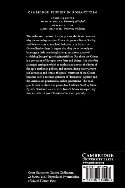 Through close readings of major poems, this book examines why the second-generation Romantic poets - Byron, Shelley, and Keats - stage so much of their poetry in Eastern or Orientalized settings. It argues that they do so not only to interrogate their own imaginations, but also as a way of criticizing Europe's growing imperialism. For them the Orient is a projection of Europe's own fears and desires. It is therefore a charged setting in which to explore and contest the limits of the age's aesthetics, politics and culture. Being nearly always self-conscious and ironic, the poets' treatment of the Orient becomes itself a twinned criticism of 'Romantic' egotism and the Orientalism practised by earlier generations. The book goes further to claim that poems like Shelley's Revolt of Islam, Byron's 'Eastern' Tales, or even Keats's Lamia anticipate key issues at stake in postcolonial studies more generally.