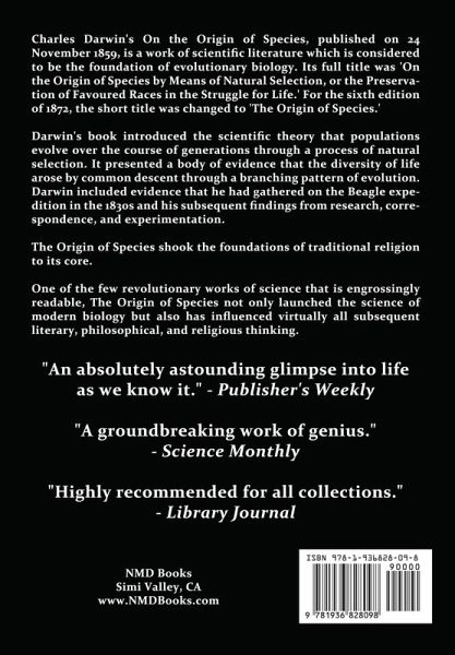 Charles Darwin's On the Origin of Species, published on 24 November 1859, is a work of scientific literature which is considered to be the foundation of evolutionary biology. Its full title was 'On the Origin of Species by Means of Natural Selection, or the Preservation of Favoured Races in the Struggle for Life.' For the sixth edition of 1872, the short title was changed to 'The Origin of Species.' Darwin's book introduced the scientific theory that populations evolve over the course of generations through a process of natural selection. It presented a body of evidence that the diversity of life arose by common descent through a branching pattern of evolution. Darwin included evidence that he had gathered on the Beagle expedition in the 1830s and his subsequent findings from research, correspondence, and experimentation. The Origin of Species shook the foundations of traditional religion to its core. One of the few revolutionary works of science that is engrossingly readable, The Origin of Species not only launched the science of modern biology but also has influenced virtually all subsequent literary, philosophical, and religious thinking. This Special Collector's Edition includes an Introduction by Charles Darwin. REVIEWS: "An absolutely astounding glimpse into life as we know it." - Publisher's Weekly "A groundbreaking work of genius." - Science Monthly "Highly recommended for all collections." - Library Journal