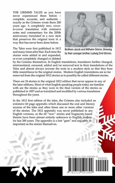 The Grimms Tales as you have never experienced them before - complete, accurate, and authentic - exactly as the Grimms wrote them 200 years ago. A completely new, cover-to-cover translation with extensive notes and commentary for the 200th anniversary translated in a new style that preserves the original texts in a way that has never been done before. There are 34 stories in the original 1812 edition that never appear in any of the later editions. In the 1812 first edition of the tales, the Grimms also included an extensive 60 page appendix which discussed the oral and literary sources of the tales and often times one or more other versions of the stories. The 1812 appendix was never published in any English versions, so the 60 "new" stories and fragments found therein have been almost entirely unknown to English readers for last 200 years. The appendix is a lost "gem" and arguably as important as the stories themselves.