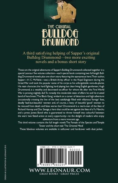 A third satisfying helping of Sapper's original Bulldog Drummond-two more exciting novels and a bonus short story These are the original adventures of Sapper's Bulldog Drummond collected together in a special Leonaur five volume collection-each special book containing two full length Bulldog Drummond novels plus one short story featuring the eponymous hero. Their author, Sapper-H. C. McNeile-was a British Army officer in the Royal Engineers during the Great War and took the popular name of his corps as his unforgettable nom-de-plume. His main character, the hard fighting, hard playing but clean living English gentleman, Hugh Drummond, is a wealthy and decorated ex-officer for whom life after the First World War is proving mightily dull. To remedy this intolerable state of affairs he and his trusted band of henchmen, 'The Black Gang,' embark on a career of detection and high adventure (occasionally crossing the line of the law) satisfyingly filled with villainous 'foreign' foes, deadly 'bad-but-beautiful' women and, of course, a bevy of beautiful 'good' women to be rescued from death and fates worse than! Drummond is a man's-man of the likes of Richard Hannay and Doc Savage, a hero that could be set against the likes of a Fu Manchu and a proto James Bond who is guaranteed to throw himself into colourful 'between the wars' two fisted action at every opportunity-to the delight of readers who enjoy adventure from a more innocent age. This third volume contains the full length novels The Female of the Species and Temple Tower and the short tale 'The Oriental Mind.' Leonaur editions are newly typeset and are not facsimiles; each title is available in softcover and hardback with dustjacket-a credit to every collection and bookshelf.
