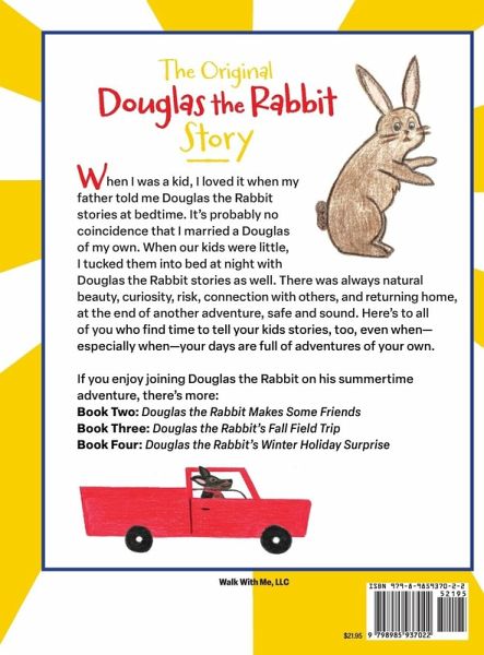 I wrote and illustrated the Douglas the Rabbit Adventure Series, for kids of all ages, in memory of my dad. The first book, The Original Douglas the Rabbit Story, takes place in the summer and introduces Douglas and his adventurous spirit. The second book, Douglas the Rabbit Makes Some Friends, goes back to the previous spring to describe how Douglas got to know a bird, a skunk, a chipmunk, and a skunk in his effort to be helpful. The third book, Douglas the Rabbit's Fall Field Trip, takes Douglas and Sammy the Skunk on another outing to Farmer Brown's farm, where they enjoy more treats and narrowly escape raspberry pickers and Buster the Dog. In the last book, Douglas the Rabbit's Winter Holiday Surprise, Douglas invites his friends to a special winter gathering to celebrate the friendship they share. Each story highlights nature's beauty and seasonal change, and concludes with fun facts to answer questions that may arise. Douglas the Rabbit is a character that my dad created for me when I was a girl. The first story stays true to the curiosity, anticipation, and humor he stirred in me way back then. The three sequels reflect my own everyday adventures with my kids and pets. Enjoy!