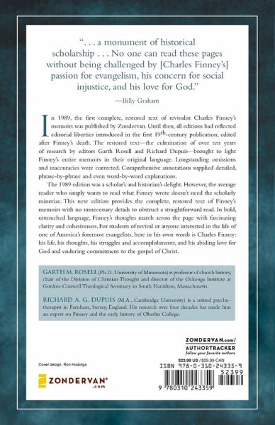 In 1989, the first complete, restored text of revivalist Charles Finney's memoirs was published by Zondervan. Until then, all editions had reflected editorial liberties introduced in the first 19th-century publication, edited after Finney's death. The restored text---the culmination of over ten years of research by editors Garth Rosell and Richard Dupuis---brought to light Finney's entire memoirs in their original language. Longstanding omissions and inaccuracies were corrected. Comprehensive annotations supplied detailed, phrase-by-phrase and even word-by-word explanations. The 1989 edition was a scholar's and historian's delight. However, the average reader who simply wants to read what Finney wrote doesn't need the scholarly minutiae. This new edition provides the complete, restored text of Finney's memoirs with no unnecessary details to obstruct a straightforward read. In bold, untouched language, Finney's thoughts march across the page with fascinating clarity and cohesiveness. For students of revival or anyone interested in the life of one of America's foremost evangelists, here in his own words is Charles Finney: his life, his thoughts, his struggles and accomplishments, and his abiding love for God and enduring commitment to the gospel of Christ.