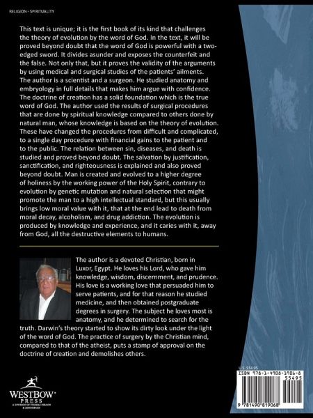 This text is unique; it is the first book of its kind that challenges the theory of evolution by the word of God. In the text, it will be proved beyond doubt that the word of God is powerful with a two-edged sword. It divides asunder and exposes the counterfeit and the false. Not only that, but it proves the validity of the arguments by using medical and surgical studies of the patients' ailments. The author is a scientist and a surgeon. He studied anatomy and embryology in full details that makes him argue with confidence. The doctrine of creation has a solid foundation which is the true word of God. The author used the results of surgical procedures that are done by spiritual knowledge compared to others done by natural man, whose knowledge is based on the theory of evolution. These have changed the procedures from difficult and complicated, to a single day procedure with financial gains to the patient and to the public. The relation between sin, diseases, and death is studied and proved beyond doubt. The salvation by justification, sanctification, and righteousness is explained and also proved beyond doubt. Man is created and evolved to a higher degree of holiness by the working power of the Holy Spirit, contrary to evolution by genetic mutation and natural selection that might promote the man to a high intellectual standard, but this usually brings low moral value with it, that at the end lead to death from moral decay, alcoholism, and drug addiction. The evolution is produced by knowledge and experience, and it caries with it, away from God, all the destructive elements to humans.