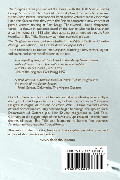The Originals takes you behind the scenes with the 10th Special Forces Group, Airborne, the first Special Forces deployed overseas, later known as the Green Berets. Paratroopers, hand-picked veterans from World War II and the Korean War, they were the first to complete a new concept of guerilla warfare training at Fort Bragg. Their world is shown in authentic detail by the author who has known them since the moment in 1953 when their advance party marched into the Park Hotel bar in Bad Tölz, Germany, as if they owned the place. It is the story of Kate O'Brien, an American woman who is caught in the dangerous lives and fortunes of these extraordinary men. Awarded semi-finalist in the William Faulkner Creative Writing Competition, The Pirate's Alley Society in 1998. Second edition features a new format, layout, and cover, plus some modifications to the text.