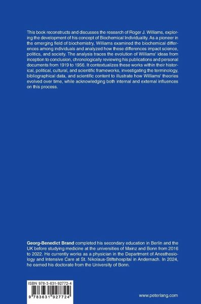 This book reconstructs and discusses the research of Roger J. Williams, exploring the development of his concept of Biochemical Individuality. As a pioneer in the emerging field of biochemistry, Williams examined the biochemical differences among individuals and analyzed how these differences impact science, politics, and society. The analysis traces the evolution of Williams' ideas from inception to conclusion, chronologically reviewing his publications and personal documents from 1919 to 1956. It contextualizes these works within their historical, political, cultural, and scientific frameworks, investigating the terminology, bibliographical data, and scientific content to illustrate how Williams' theories evolved over time, while acknowledging both internal and external influences on this process.