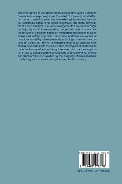 1 The Concept of Action: A Historical Perspective.- I. Introduction.- II. Action theory and the organismic paradigm.- III. On autonomous man.- IV. Alternative action models.- V. A learning theory approach.- VI. Actions and psychological theory.- VII. Intentional actions.- VIII. Structural developmental theory and action theory.- IX. The concept of "locus of control".- X. Plans of action.- XI. A developmental perspective.- XII. Conclusion.- 2 Determinants of Action: An Organismic and Holistic Approach.- I. Introduction.- II. Self-regulation.- III. How selfish is self-regulation?.- IV. Determinants of action.- V. An activity-levels model of development: Organism- environment interaction.- VI. Development of the self-system.- 3 Self-object Relation as a Basis of Human Development.- I. Introduction.- II. The formation of self-object relations.- III. The social nature of object relations.- IV. The other side of the coin: Social interaction as shared object relations.- V. Valences of objects.- VI. General principles of self-object relations: Looking at the process.- VII. Some developmental trends.- VIII. Application of the action categories to children's role play: summarizing demonstration.- IX. Concluding remarks.- 4 The Role of Internalization in the Transfer of Mnemonic Strategies.- I. Introduction.- II. A framework for examining transfer.- III. Current research on the transfer of memory strategies.- IV. The development of transfer skill: Analyzing variability.- V. Children as adaptive memorizers: The Vygotskyan approach and the social nature of cognitive tasks.- 5 The Significance and Function of Students' Goals.- I. Introduction.- II. The significance of students' goals.- III. Dimensions of students' goals.- IV. Changes and stabilities in students' goals.-V. Conclusion.- 6 Interests and their Structural Development: Theoretical Reflections.- I. Introduction.- II. Philosophy of man: Relationships with the environment and action theory.- III. Affect and motivation.- IV. Social cognition.- V. Model of self-regulation.- VI. The development of self-regulation: A selective review of the literature.- VII. Conclusion.- 7 Interest Development as Structural Change in Person-Object Relationships.- I. Introduction.- II. Theoretical framework.- III. Structural aspects of the development of interest.- IV. The interest genesis Project: Goals and methods.- V. Theoretical clarification of casuistic results.- VI. Concluding remarks.- 8 Continuity in Young Children's Actions: A Consideration of Interest and Temperament.- I. Introduction.- II. Interest.- III. Temperament.- IV. The role of interest in young children's temperament.- V. Interest, temperament, and action.- VI. Conclusions.- 9 Interests and Their Structural Development: A Qualitative Content Analysis.- I. Introduction.- II. The development of interests.- III. Interests: Two exploratory studies.- IV. Additional empirical evidence.- V. General conclusion.- Author Index.