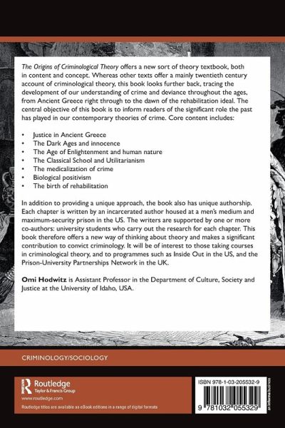The Origins of Criminological Theory offers a new sort of theory textbook, both in content and concept. Whereas other texts offer a mainly twentieth century account of criminological theory, this book looks further back, tracing the development of our understanding of crime and deviance throughout the ages, from Ancient Greece right through to the dawn of the rehabilitation ideal. The central objective of this book is to inform readers of the significant role the past has played in our contemporary theories of crime. Core content includes:
