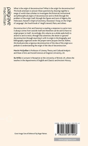 In these essays, a range of leading scholars seek both to investigate the historical, institutional and philosophical origins of deconstruction and to think through the problem of the idea of origin itself.