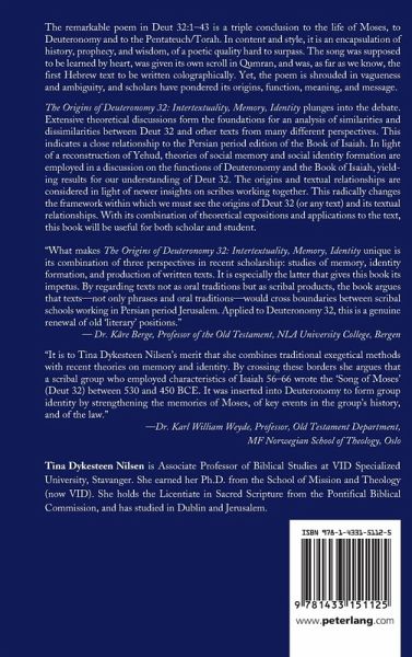"What makes The Origins of Deuteronomy 32: Intertextuality, Memory, Identity unique is its combination of three perspectives in recent scholarship: studies of memory, identity formation, and production of written texts. It is especially the latter that gives this book its impetus. By regarding texts not as oral traditions but as scribal products, the book argues that texts-not only phrases and oral traditions-would cross boundaries between scribal schools working in Persian period Jerusalem. Applied to Deuteronomy 32, this is a genuine renewal of old 'literary' positions." -Kåre Berge, Professor of Old Testament at NLA University College, Bergen