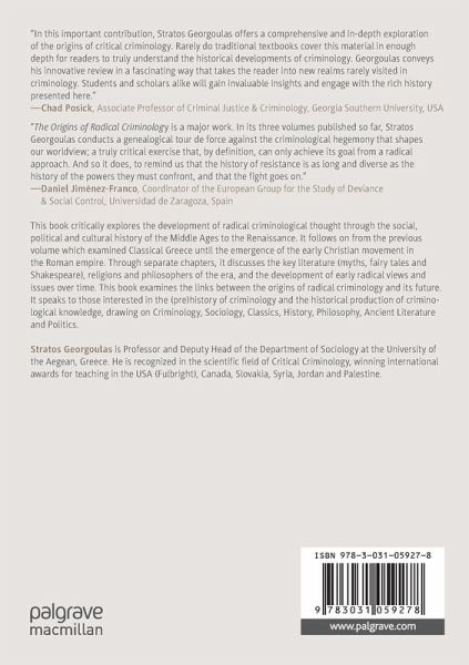 This book critically explores the development of radical criminological thought through the social, political and cultural history of the Middle Ages to the Renaissance. It follows on from the previous volume which examined Classical Greece until the emergence of the early Christian movement in the Roman empire. Through separate chapters, it discusses the key literature (myths, fairy tales and Shakespeare), religions and philosophers of the era, and the development of early radical views and issues over time. This book examines the links between the origins of radical criminology and its future. It speaks to those interested in the (pre)history of criminology and the historical production of criminological knowledge, drawing on Criminology, Sociology, Classics, History, Philosophy, Ancient Literature and Politics.