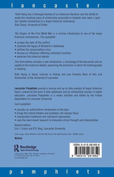 First published in 2003. There is an enormous literature on the origins of the First World War and this pamphlet focuses on the major issues involved in the topic and assesses the validity of the different interpretations. Beginning with the legacy of Bismarck's diplomacy between 1871 and 1890, Ruth Henig surveys the roots of the conflict and outlines the assassination crisis which led to war in August 1914, looking especially at the factors which influenced individual countries to mobilize their armed forces. She goes on to consider how the long-term factors leading up to the crisis of 1914 and the crisis itself have been interpreted by successive generations of historians since 1919, including the recent arguments concerning German responsibility for the outbreak of war.