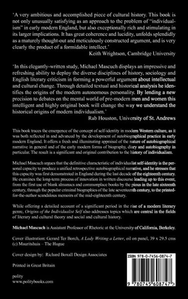 This book traces the emergence of the concept of self-identity in modern Western culture, as it was both reflected in and advanced by the development of autobiographical practice in early modern England. It offers a fresh and illuminating appraisal of the nature of autobiographical narrative in general and of the early modern forms of biography, diary and autobiography in particular. The result is a significant and original contribution to the history of individualism. Michael Mascuch argues that the definitive characteristic of individualist self-identity is the personal capacity to produce a unified retrospective autobiographical narrative, and he stresses that this capacity was first demonstrated in England during the last decade of the eighteenth century. He examines the long-term process of innovation in written discourse leading up to this event, from the first use of blank almanacs and common place books by the pious in the late sixteenth century, through the popular criminal biographies of the late seventeenth century, to the printed-for-the-author scandalous memoirs of the mid-eighteenth century. While offering a detailed account of a significant period in the rise of a modern literary genre, Origins of the Individualist Self also addresses topics which are central in the fields of literary and cultural theory and social and cultural history.