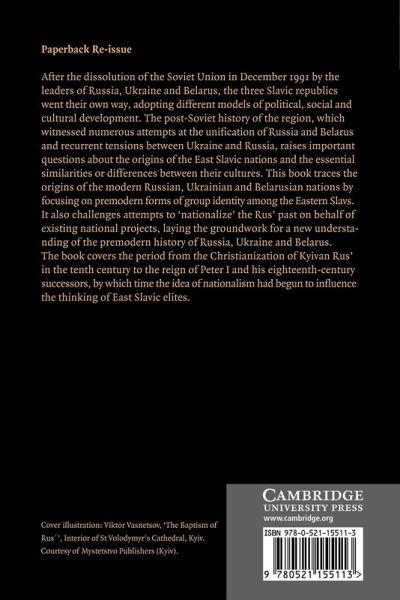 A study of the origins of the modern Russian, Ukrainian and Belarusian nations, covering the period from the tenth century to the reign of Peter I and his eighteenth-century successors, by which time the idea of nationalism had begun to influence the thinking of East Slavic elites.