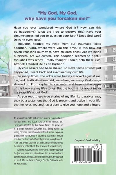 ** Reader Views Reviewers Choice Award - Gold Medal Winner, Religion/Spirituality/Instruction ** Independent Press Award - Distinguished Favorite, Christian "My God, My God, why have you forsaken me?" Have you ever wondered where God is? How can this be happening? What did I do to deserve this? Have your circumstances led you to question your faith? Does God care? Does he even exist? Thoughts flooded my head from our traumatic failed adoption. “Lord, where were you this time? Is this how our seven-year-long journey to have children ends? Are we being punished? Are we cursed? This adoption seemed so right. I thought I was ready. I really thought I could help these kids. After all, I started life as an Orphan.” My core beliefs had been shaken. To make sense of what just happened, I went back and examined my own life. So many times, the odds were heavily stacked against me, life, and death situations. Yet, somehow, someway, God always showed up. From orphan to carpenter and beyond, the pages of this book are my life stories. But the book is not about me or my story. It’s about God’s. As you read these true stories of my life like parables, may they be a testament that God is present and active in your life, that he loves you and has a plan to give you hope and a future.