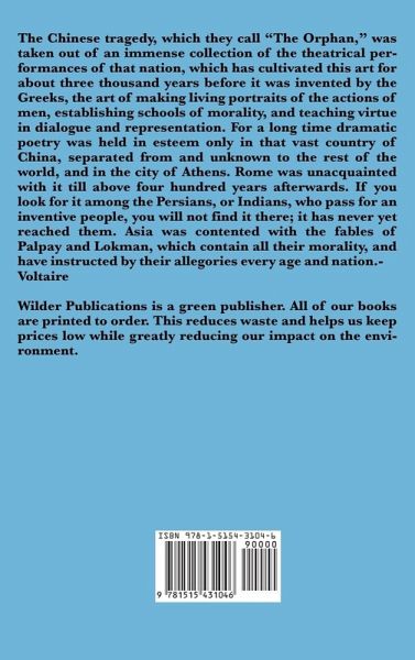 The Chinese tragedy, which they call "The Orphan," was taken out of an immense collection of the theatrical performances of that nation, which has cultivated this art for about three thousand years before it was invented by the Greeks, the art of making living portraits of the actions of men, establishing schools of morality, and teaching virtue in dialogue and representation.