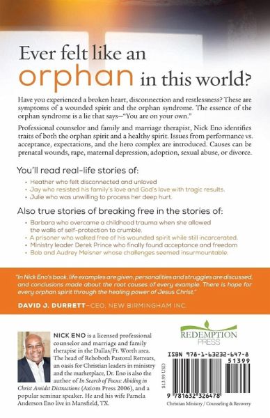 A counselor outlines the symptoms of a wounded orphan spirit vs. a healthy spirit and how an orphan spirit affects our relationships and ability to receive love. From alienation, disconnection, restlessness, to an inability to sense God's love, the syndrome is characterized by the lie that says, "You're on your own." Nick Eno provides dynamic, real-life examples of individuals who have struggled with this syndrome, and those who have been healed and transformed by the love of God. How to break free from the bondage of the orphan syndrome to finding your home in God as his son or daughter.
