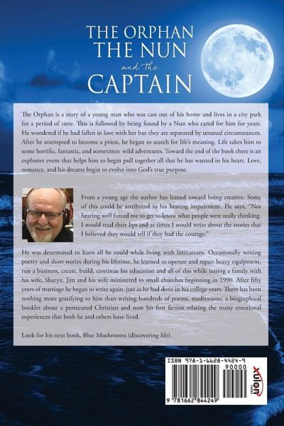 The Orphan is a story of a young man who was cast out of his home and lives in a city park for a period of time. This is followed by being found by a Nun who cared for him for years. He wondered if he had fallen in love with her but they are separated by unusual circumstances. After he attempted to become a priest, he began to search for life's meaning. Life takes him to some horrific, fantastic, and sometimes wild adventures. Toward the end of the book there is an explosive event that helps him to begin pull together all that he has wanted in his heart. Love, romance, and his dreams begin to evolve into God's true purpose. From a young age the author has leaned toward being creative. Some of this could be attributed to his hearing impairment. He says, "Not hearing well forced me to get to know what people were really thinking. I would read their lips and at times I would write about the stories that I believed they would tell if they had the courage." He was determined to learn all he could while living with limitations. Occasionally writing poetry and short stories during his lifetime, he learned to operate and repair heavy equipment, run a business, create, build, continue his education and all of this while raising a family with his wife, Sharyn. Jim and his wife ministered to small churches beginning in 1990. After fifty years of marriage he began to write again, just as he had done in his college years. There has been nothing more gratifying to him than writing hundreds of poems, meditations, a biographical booklet about a persecuted Christian and now his first fiction relating the many emotional experiences that both he and others have lived. Look for his next book, Blue Mushrooms (discovering life).