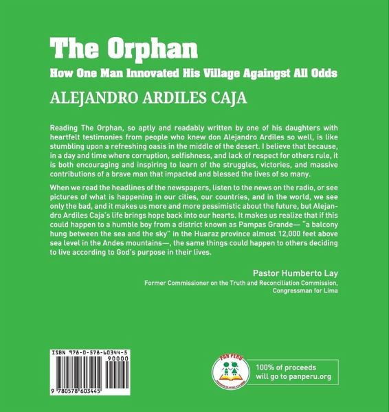 The Orphan is a biography about Don Alejandro Ardiles -- an entrepreneur, mayor, and leader of the Andean pueblo of Pampas Grande, Huaraz, Ancash. Alejandro's life is a role model for perseverance, tenacity, and discipline.