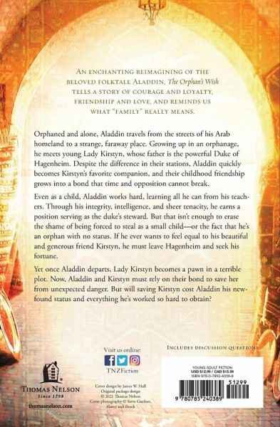 A reimagining of the beloved folktale, Aladdin, set in medieval Germany. Orphaned and alone, Aladdin travels from the streets of his Arab homeland to a strange, faraway place. Growing up in an orphanage, he meets young Lady Kirstyn, whose father is the powerful Duke of Hagenheim. Despite the difference in their stations, Aladdin quickly becomes Kirstyn's favorite companion, and their childhood friendship grows into a bond that time and opposition cannot break. Even as a child, Aladdin works hard, learning all he can from his teachers. Through his integrity, intelligence, and sheer tenacity, he earns a position serving as the duke's steward. But that isn't enough to erase the shame of being forced to steal as a small child--or the fact that he's an orphan with no status. If he ever wants to feel equal to his beautiful and generous friend Kirstyn, he must leave Hagenheim and seek his fortune. Yet once Aladdin departs, Lady Kirstyn becomes a pawn in a terrible plot. Now, Aladdin and Kirstyn must rely on their bond to save her from unexpected danger. But will saving Kirstyn cost Aladdin his newfound status and everything he's worked so hard to obtain? An enchanting new version of the well-known tale, The Orphan's Wish tells a story of courage and loyalty, friendship and love, and reminds us what "family" really means.
