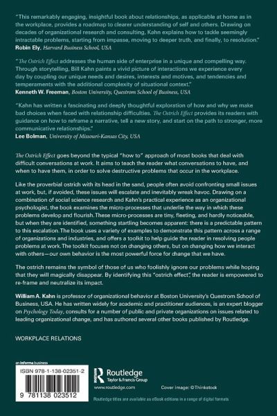 The Ostrich Effect goes beyond the typical "how to" approach of most books that deal with difficult conversations at work. It aims to teach the reader what conversations to have, and when to have them, in order to solve destructive problems that occur in the workplace. Like the proverbial ostrich with its head in the sand, people often avoid confronting small issues at work, but, if avoided, these issues will escalate and inevitably wreak havoc. Drawing on a combination of social science research and Kahn's practical experience as an organizational psychologist, the book examines the micro-processes that underlie the way in which these problems develop and flourish. These micro-processes are tiny, fleeting, and hardly noticeable, but when they are identified, something startling becomes apparent: there is a predictable pattern to this escalation. The book uses a variety of examples to demonstrate this pattern across a range of organizations and industries, and offers a toolkit to help guide the reader in resolving people problems at work. The toolkit focuses not on changing others, but on changing how we interact with others-our own behavior is the most powerful force for change that we have. The ostrich remains the symbol of those of us who foolishly ignore our problems while hoping that they will magically disappear. By identifying this "ostrich effect", the reader is empowered to re-frame and neutralize its impact.
