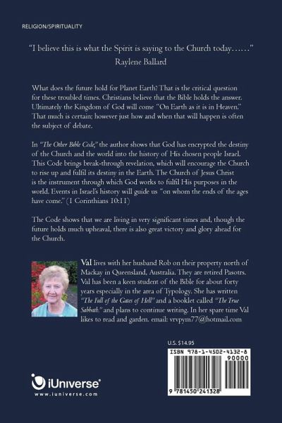 Book Overview What does the future hold for Planet Earth? That is the critical question for these troubled times. Christians believe that the Bible holds the answer. Ultimately the Kingdom of God will come ¿On Earth as it is in Heaven.¿ That much is certain; however just how and when that will happen is often the subject of debate. In ¿The Other Bible Code,¿ the author shows that God has encrypted the destiny of the Church and the world into the history of His chosen people Israel. This Code brings break-through revelation, which will encourage the Church to rise up and fulfil its destiny in the Earth. The Church of Jesus Christ is the instrument through which God works to fulfil His purposes in the world. Events in Israel¿s history will guide us ¿on whom the ends of the ages have come.¿ (1 Corinthians 10:11) The Code shows that we are living in very significant times and, though the future holds much upheaval, there is also great victory and glory ahead for the Church. Kirkus Reviews "Pym, a retired [lay] pastor, offers a new perspective on interpreting the Bible to determine what will happen during the end times and how Christians should focus their efforts now, in light of that ultimate destiny. Pym¿s prose is clear and she cites scripture regularly in order to support her interpretation¿.the topics Pym discusses are inherently controversial¿¿.many readers will be in for an argument. Others will find themselves renewed and inspired in their efforts to live out their faith in a meaningful way that will change the world. For readers fascinated by the end times or typology, this book will offer a somewhat unusual perspective." CALEB Reviews "¿¿. The Other Bible Code is a well researched and informative book which ties together the Hebrew and Christian Scriptures in fascinating and soundly Biblical ways¿¿¿¿¿.. [It] makes plain many hidden concepts in the Bible and brings them out the shadows and exposes them to the light." Crystal M. Lindsey "Sister Crystal Mary Lindsey" As you read this book, the eyes of your heart will be opened. To me it felt like a light had been turned on in my mind as I recognised the TRUTH in what she had written. I was amazed, why hadn't I seen this before? As I read this book I felt a stirring and an discernment of how important Israel's role is, to Christ's return. Read it and find out for yourself.
