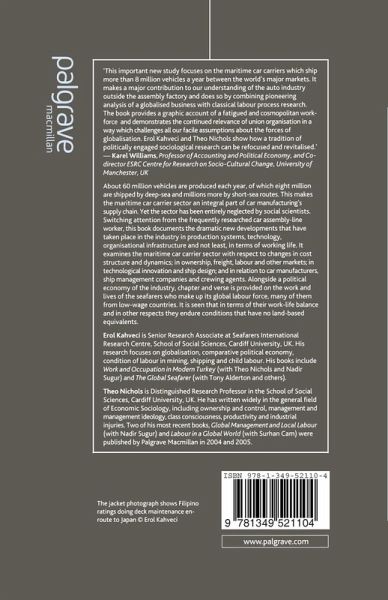 'This important new study focuses on the maritime car carriers which ship more than 8 million vehicles a year between the world's major markets. It makes a major contribution our understanding of the auto industry outside the assembly factory and does so by combining pioneering analysis of a globalized business with classical labour process research. The book provides a graphic account of a fatigued and cosmopolitan workforce and demonstrates the continued relevance of union organisation in a way which challenges all our facile assumptions about the forces of globalisation. Theo Nichols and Erol Kahveci show how a tradition of politically engaged sociological research can be refocused and revitalized.' - Karel Williams, Professor of Accounting and Political Economy, and Co-director ESRC Centre for Research on Socio-Cultural Change, University of Manchester, UK