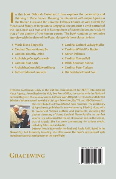 In this book Deborah Castellano Lubov explores the personality and thinking of Pope Francis. Drawing on interviews with major figures in the Roman Curia and the universal Catholic Church, as well as with the friends and family of Jorge Mario Bergoglio, she presents a vivid portrait of the Pope, both as a man and in his treatment of current issues, particularly that of the dignity of the human person. The book contains an exclusive interview with the sister of the Pope, along with those closest to him: ¿ Maria Elena Bergoglio ¿ Cardinal Charles Maung Bo ¿ Cardinal Timothy Dolan ¿ Archbishop Georg Ganswein ¿ Cardinal Kurt Koch ¿ Archbishop Joseph Edward Kurtz ¿ Father Federico Lombardi ¿ Cardinal Gerhard Ludwig Muller ¿ Cardinal Wilfrid Fox Napier ¿ Adrian Pallarols ¿ Cardinal George Pell ¿ Rabbi Abraham Skorka ¿ Cardinal Peter Turkson ¿ His Beatitude Fouad Twal
