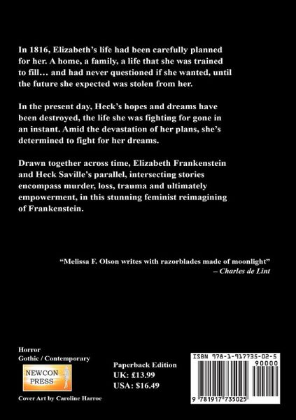 In 1816, Elizabeth's life had been carefully planned for her. A home, a family, a life that she was trained to fill... and had never questioned if she wanted, until the future she expected was stolen from her. In the present day, Heck's hopes and dreams have been destroyed, the life she was fighting for gone in an instant. Amid the devastation of her plans, she's determined to fight for her dreams. Drawn together across time, Elizabeth Frankenstein and Heck Saville's parallel, intersecting stories encompass murder, loss, trauma and ultimately empowerment, in this stunning feminist reimagining of Frankenstein. "Melissa F. Olson writes with razorblades made of moonlight" - Charles de Lint Melissa F. Olson is the author of more than a dozen books in the Old World universe, the PI mystery The Big Keep, and numerous short stories and novellas, including the Nightshades trilogy.
