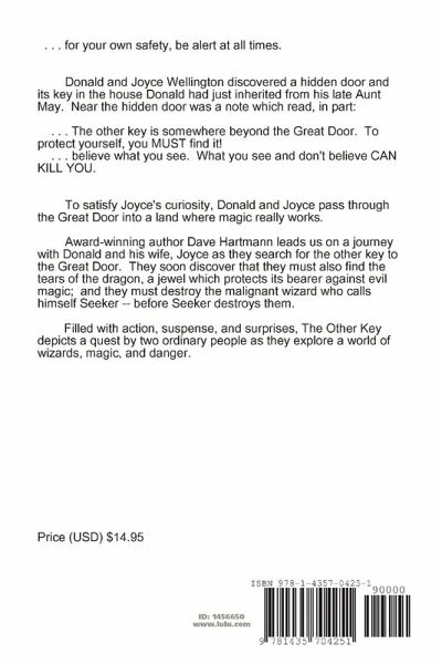 Donald and Joyce Wellington discovered a hidden door and its key in the house Donald had just inherited from his late Aunt May. Near the hidden door was a note which read, in part: . . . The other key is somewhere beyond the Great Door. To protect yourself, you must find it! . . . What you see and don't believe can kill you. To satisfy Joyce's curiosity, Donald and Joyce pass through the Great Door into a land where magic really works. The Other Key leads us on a journey with Donald and his wife, Joyce as they search for the other key to the Great Door. They soon discover that they must also find the tears of the dragon, a jewel which protects its bearer against evil magic; and they must destroy the malignant wizard who calls himself Seeker -- before Seeker destroys them. Filled with action, suspense, and surprises, The Other Key depicts a quest by two ordinary people as they explore a world of wizards, magic, and danger.