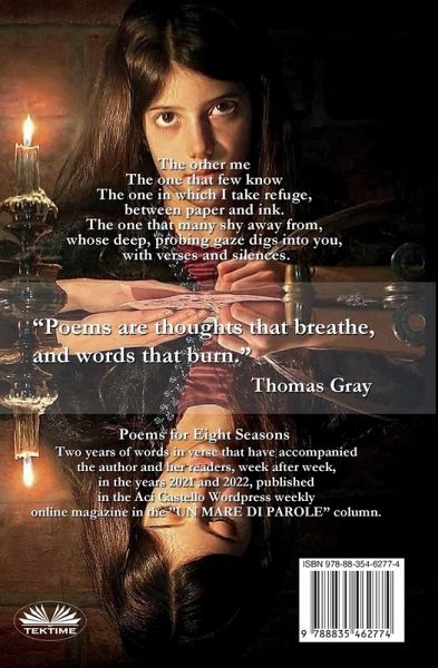 The other me The one that few know The one in which I take refuge, between paper and ink. The one that many shy away from, whose deep, probing gaze digs into you, with verses and silences. Poems for Eight Seasons Two years of words in verse that have accompanied the author and her readers, week after week, in the years 2021 and 2022, published in the Aci Castello Wordpress weekly online magazine in the "UN MARE DI PAROLE" column.