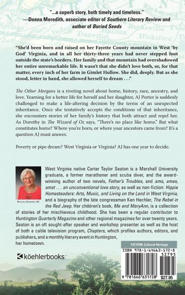 "She'd been born and raised on her Fayette County mountain in West 'by God' Virginia, and in all her thirty-three years had never stepped foot outside the state's borders. Her family and that mountain had overshadowed her entire unremarkable life. It wasn't that she didn't love both, or, for that matter, every inch of her farm in Gimlet Hollow. She did, deeply. But as she stood, letter in hand, she allowed herself to dream . . ." The Other Morgans is a riveting novel about home, history, race, ancestry, and love. Yearning for a better life for herself and her daughter, AJ is suddenly challenged to make a life-altering decision by the terms of an unexpected inheritance. Once she tentatively accepts the conditions of that inheritance, she encounters stories of her family's history that both attract and repel her. As Dorothy in The Wizard of Oz says, "There's no place like home." But what constitutes home? Where you're born, or where your ancestors came from? It's a question AJ must answer. Poverty or pipe dream? West Virginia or Virginia? AJ has one year to decide.