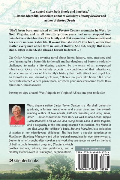 "She'd been born and raised on her Fayette County mountain in West 'by God' Virginia, and in all her thirty-three years had never stepped foot outside the state's borders. Her family and that mountain had overshadowed her entire unremarkable life. It wasn't that she didn't love both, or, for that matter, every inch of her farm in Gimlet Hollow. She did, deeply. But as she stood, letter in hand, she allowed herself to dream . . ." The Other Morgans is a riveting novel about home, history, race, ancestry, and love. Yearning for a better life for herself and her daughter, AJ is suddenly challenged to make a life-altering decision by the terms of an unexpected inheritance. Once she tentatively accepts the conditions of that inheritance, she encounters stories of her family's history that both attract and repel her. As Dorothy in The Wizard of Oz says, "There's no place like home." But what constitutes home? Where you're born, or where your ancestors came from? It's a question AJ must answer. Poverty or pipe dream? West Virginia or Virginia? AJ has one year to decide.