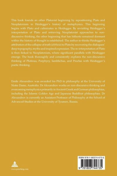 This book founds an other Platonist beginning by repositioning Plato and Neoplatonism in Heidegger's history of metaphysics. This beginning begins with Plato and culminates in Heidegger. By revisiting Heidegger's interpretation of Plato and retrieving Neoplatonist approaches to non-discursive thinking, the other beginning that has hitherto remained dormant within the history of thought is established. The author re-thinks Heidegger's attribution of the collapse of truth (al theia) to Plato by recovering the dialogues' deep topography, myths and inspired expression. The re-interpretation of Plato is then linked to Neoplatonism, where significant parallels with Heidegger emerge. The book thoroughly and consistently explores the non-discursive thinking of Plotinus, Porphyry, Iamblichus, and Proclus with Heidegger's poetic thinking.