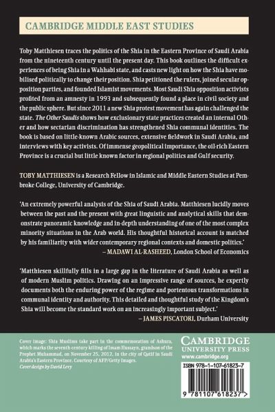 Toby Matthiesen traces the politics of the Shia in the Eastern Province of Saudi Arabia from the nineteenth century until the present day. This book outlines the difficult experiences of being Shia in a Wahhabi state, and casts new light on how the Shia have mobilised politically to change their position. Shia petitioned the rulers, joined secular opposition parties and founded Islamist movements. Most Saudi Shia opposition activists profited from an amnesty in 1993 and subsequently found a place in civil society and the public sphere. However, since 2011 a new Shia protest movement has again challenged the state. The Other Saudis shows how exclusionary state practices created an internal Other and how sectarian discrimination has strengthened Shia communal identities. The book is based on little-known Arabic sources, extensive fieldwork in Saudi Arabia and interviews with key activists. Of immense geopolitical importance, the oil-rich Eastern Province is a crucial but little known factor in regional politics and Gulf security.