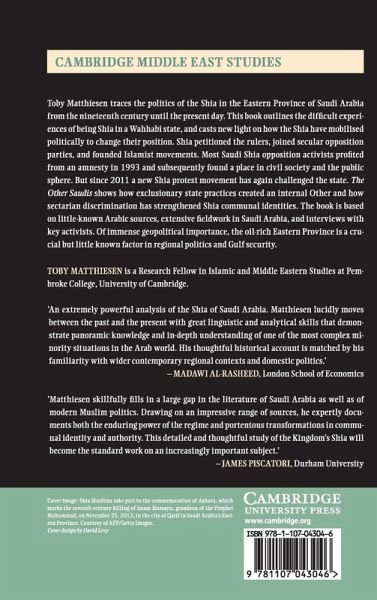 Toby Matthiesen traces the politics of the Shia in the Eastern Province of Saudi Arabia from the nineteenth century until the present day. This book outlines the difficult experiences of being Shia in a Wahhabi state, and casts new light on how the Shia have mobilised politically to change their position. Shia petitioned the rulers, joined secular opposition parties and founded Islamist movements. Most Saudi Shia opposition activists profited from an amnesty in 1993 and subsequently found a place in civil society and the public sphere. However, since 2011 a new Shia protest movement has again challenged the state. The Other Saudis shows how exclusionary state practices created an internal Other and how sectarian discrimination has strengthened Shia communal identities. The book is based on little-known Arabic sources, extensive fieldwork in Saudi Arabia and interviews with key activists. Of immense geopolitical importance, the oil-rich Eastern Province is a crucial but little known factor in regional politics and Gulf security.