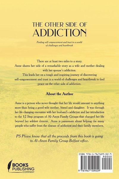 There are at least two sides to a Story. Anne shares her side of a remarkable story as a wife and mother dealing with her spouse 's addiction. This leads her on a tough and inspiring journey Of discovering self-empowerment and trust in a world of challenges and heartbreak to find peace on the other side of addiction.