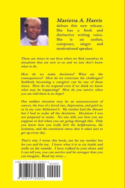How do you handle a crisis in your life? Alzheimer's is just one condition that requires loved ones to be caregivers. We become caregivers not by choice and once we are, we lose our choices. This is a story of a woman who faced those choices and survived. 13:978-0-615-32820-1
