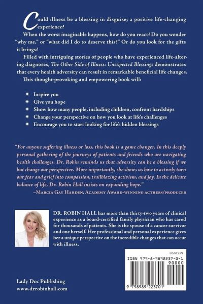Dr. Robin Hall is a board-certified family physician, speaker, entrepreneur, and medical educator with over thirty-two years of clinical experience. She was a former assistant clinical professor in the Department of Family Medicine at The University of North Texas Health Science Center, Texas College of Osteopathic Medicine, and has also served as chief of the Family Medicine Department at Baylor Regional Medical Center in Grapevine, Texas. She has won numerous accolades and awards as an outstanding doctor in her local community and Texas. Dr. Hall founded Destination Health(TM), one of the first concierge practices in the country. Both Dr. Hall and her spouse are cancer survivors. Due to her own experience, and by caring for thousands of patients, she has witnessed that illness of all types can be a blessing in disguise. In this book, she shares inspiring stories of others who have also come to realize this.Dr. Hall resides in Texas with her husband and two maltipoos. She enjoys traveling, reading, speaking, and spending time with family and friends. To share your story of blessings after illness, or for media appearances and speaking requests, contact Dr. Hall through her website at: https://www.drrobinhall.com