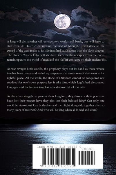 A king will die, another will emerge; two worlds will battle, one will have to start over. As Death converges on the land of Midnight it will draw all the cursed of the dark realm to its side in a final battle along with the black dragon. The elves of Waters Edge will also have to battle the unexpected as the Nel'laf converge on their ancient city. As war ravages both worlds, the prophecy plays out its hand as those whose fate has been drawn and sealed try desperately to return one of their own to his rightful place. All the while, the stone of Dalbhach cannot be conquered nor subdued for one's own purpose lest it take him, which Legña had discovered long ago, and the human king has now discovered, all too late. As the elves struggle to protect their kingdom, they discover their pendants have lost their power; have they also lost their beloved king? Can both elves and men fight along side together after so many years of mistrust? And who will be king when all is said and done?