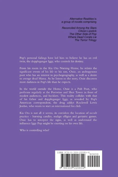 Pop's personal failings have led him to believe he has an evil twin, the doppleganger Iggy, who controls his destiny... From his room in the Kia Ora Nursing Home, he relates the significant events of his life to his son, Ossie, an androgynous poet who has an interest in psychogeography, as well as a desire to avenge dead Mama. As he listens to the story, Ossie discovers more darkness in Pop's life than he expects... In the world outside the Home, Ossie is a Pub Poet, who performs regularly at the Portwine and Shot Tower in front of modest audiences, and hecklers. This reality collides with that of his father and doppleganger Iggy, as revealed by Pop's American correspondent, the drug addict Rockwell Lewis Jordan... Kia Ora is not all it seems, its corridors the location of occult practice - burning candles, malign effigies and geriatric games. Ossie has to interpret the signs, as well as understand the influence Iggy Pop might be exerting on his own life... Who is controlling who?