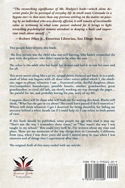 Two people have written this book. The first person was the child who was still hurting, who hadn't reconciled the past with the present, who didn't want to be what she was. The other is the adult who has faced her demon and laid it to rest for once and for all. This story moves along like a yo-yo, up and down, forward and back. It is a mishmash of what was begone with all these other voices added which I, the obedient, eager to please, whatever I am... frustrated artist, dutiful daughter, obsessive/compulsive housekeeper, possible lunatic, mother, grandmother, great grandmother, or tired old lady, am slowly working my way through the pages... the painful for me, and probably boring for you, story of my life. I suppose there will be those who will fault me for writing this book. Blacks will think, "What has she got to cry about? She could have passed if she'd wanted to." Whites will think whatever I got I deserved for being deceitful, for hiding my ancestry behind a white facade (as if I could help it). I can relate to both points of view. If this book should be published, some people my age who read it may say, "That's not the way I remember those times," or "That wasn't the way I was taught in my school." This could very well be. I've written about my time and place. These are my memories of the way things were in Coronado, California, from 1924, when I was three years old until I moved away in 1940 when I was nineteen and of things that I experienced after that. The original draft of this story ended with my suicide.