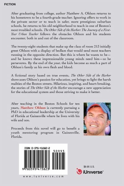 After graduating from college, author Matthew A. Ohlson returns to his hometown to be a fourth-grade teacher. Ignoring offers to work in the private sector or to teach in safer, more prestigious suburban schools, he returns to his old neighborhood to teach in one of Boston's most troubled schools. The Other Side of the Harbor follows the obstacles Ohlson and his students encounter, both in and out of the classroom. The twenty-eight students that make up the class of room 213 initially greet Ohlson with a display of bedlam that would send most teachers running in the opposite direction. But this is where he wants to be-and he knows these impressionable young minds need him-so he perseveres. By the end of the year, the kids become as much a part of Ohlson's family as his own flesh and blood. A fictional story based on true events, The Other Side of the Harbor showcases Ohlson's passion for education, yet brings to light the harsh realities of the Boston streets. Hilarious, inspiring, and heart-breaking, the stories of The Other Side of the Harbor encourage a new appreciation for the educational system and those striving to make it better.