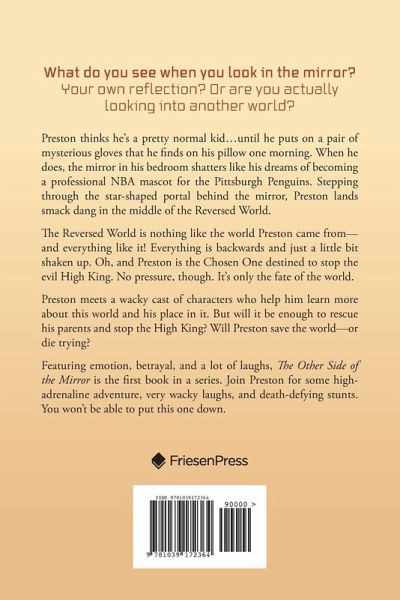 What do you see when you look in the mirror? Your own reflection? Or are you actually looking into another world? Preston thinks he's a pretty normal kid...until he puts on a pair of mysterious gloves that he finds on his pillow one morning. When he does, the mirror in his bedroom shatters like his dreams of becoming a professional NBA mascot for the Pittsburgh Penguins. Stepping through the star-shaped portal behind the mirror, Preston lands smack dang in the middle of the Reversed World. The Reversed World is nothing like the world Preston came from-and everything like it! Everything is backwards and just a little bit shaken up. Oh, and Preston is the Chosen One destined to stop the evil High King. No pressure, though. It's only the fate of the world. Preston meets a wacky cast of characters who help him learn more about this world and his place in it. But will it be enough to rescue his parents and stop the High King? Will Preston save the world-or die trying? Featuring emotion, betrayal, and a lot of laughs, The Other Side of the Mirror is the first book in a series. Join Preston for some high-adrenaline adventure, very wacky laughs, and death-defying stunts. You won't be able to put this one down.
